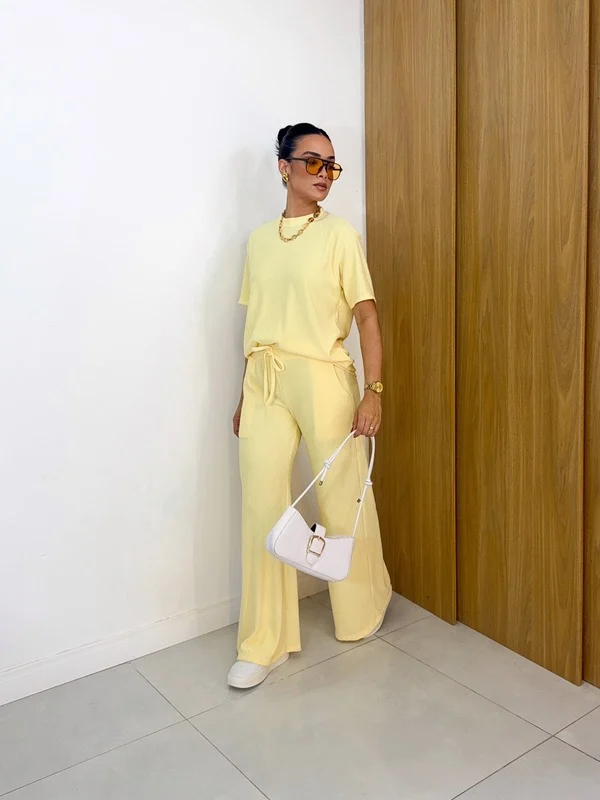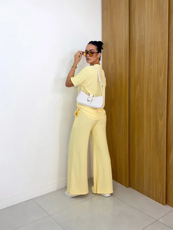 O conjunto amarelo em tecido anarruga é leve, não amassa e traz aquele ar fresh que combina com qualquer momento.