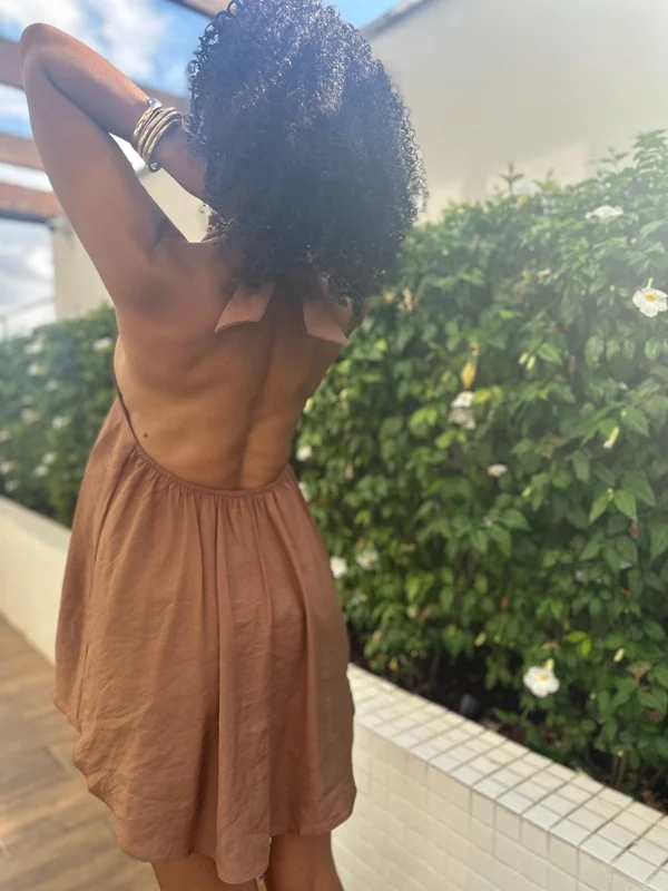 e sensualidade. O fechamento é feito por um delicado laço na nuca,