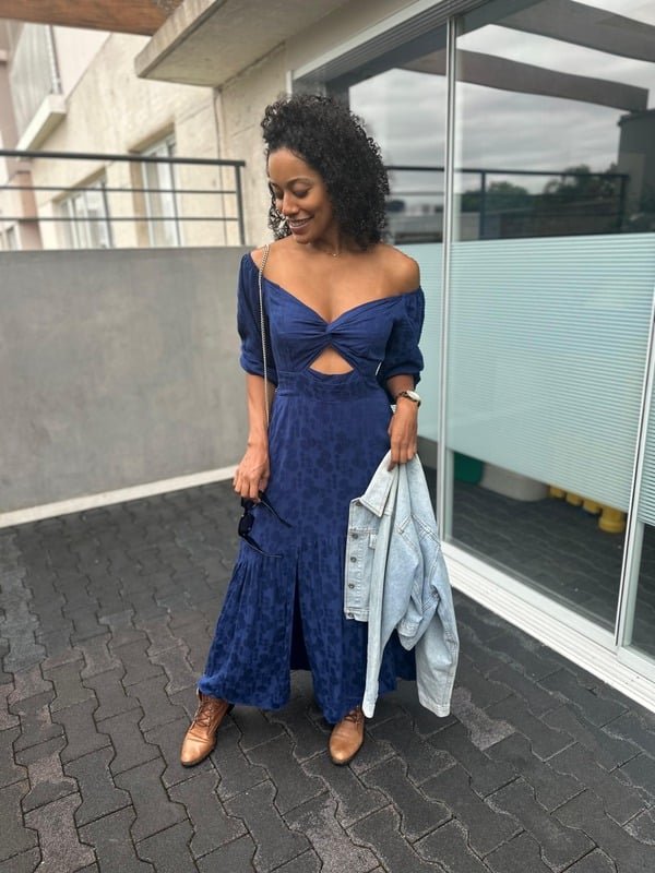 Saia Fluida: A saia longa possui uma fenda frontal discreta para maior movimento e